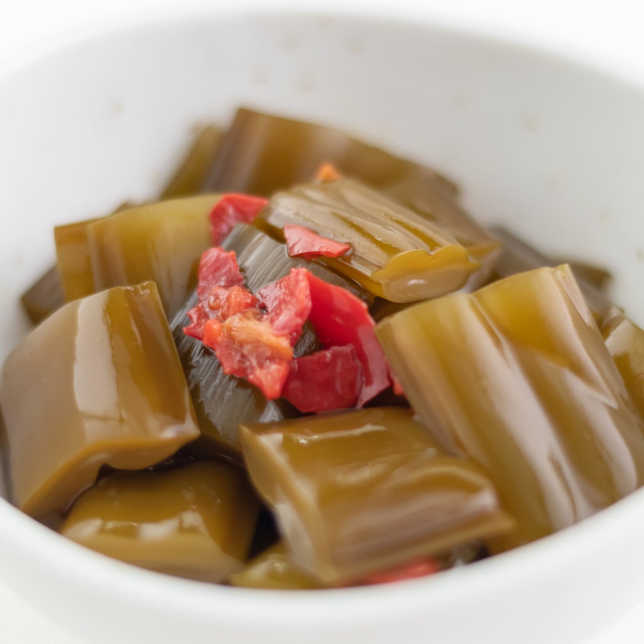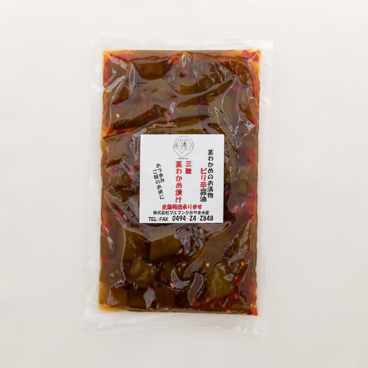 三陸産元茎(わかめの根本付近の太い茎の部分)を使用し、独自の味付けで漬物にした商品です。